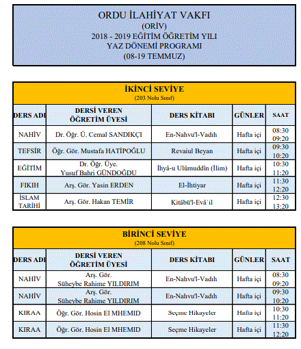 2018-2019 eğitim-öğretim döneminin sona ermesiyle birlikte başlayan kurslarımız 08-19 Temmuz tarihleri arasında hafta içi her gün olarak planlanmıştır. Bahse konu tarihlerde İlahiyat alanındaki üç temel ana bilim dalının (Temel İslam Bilimleri- Felsefe ve Din Bilimleri- İslam Tarihi ve Sanatları Bilim Dalı) ortak katkılarıyla öğrencilerimize Arapça okumalar yaptırılacaktır. Bu kapsamda düzenlenecek olan eğitim saatleri ve ders çizelgesi aşağıdadır.